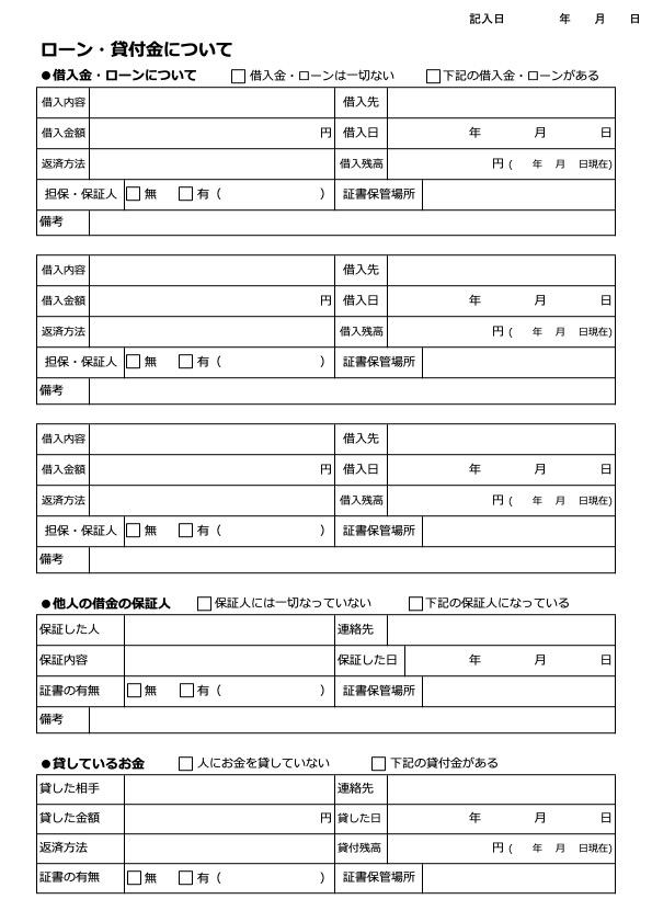 住宅ローンなど、現在負担している借入金、逆に人に貸しているお金などがあれば残さず記録しておきましょう。特に、誰かの保証人になっているときは、その手がかりを残しておかないと相続人にはわかりません。最悪の場合、相続手続後に時限爆弾のように破裂し...