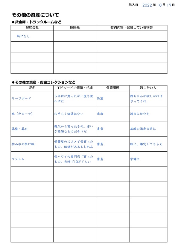 最低限、現時点で取引している金融機関の名称と支店名を書いておきます。特にネットバンクやネット証券などは通帳や郵便物などの物理的な手がかりがないこともあります。しっかりとノートに手がかりを残しておきましょう。また、口座が多いと相続後の手続きが...