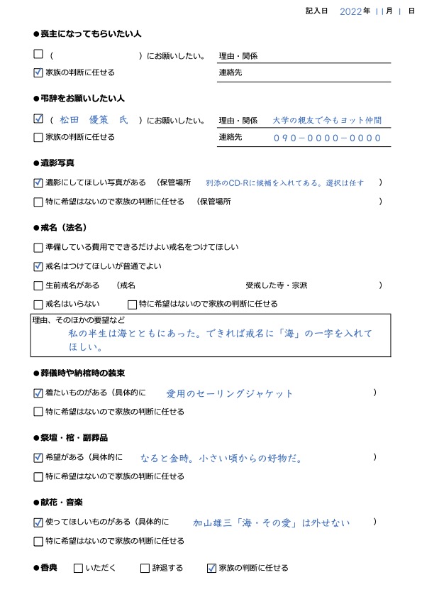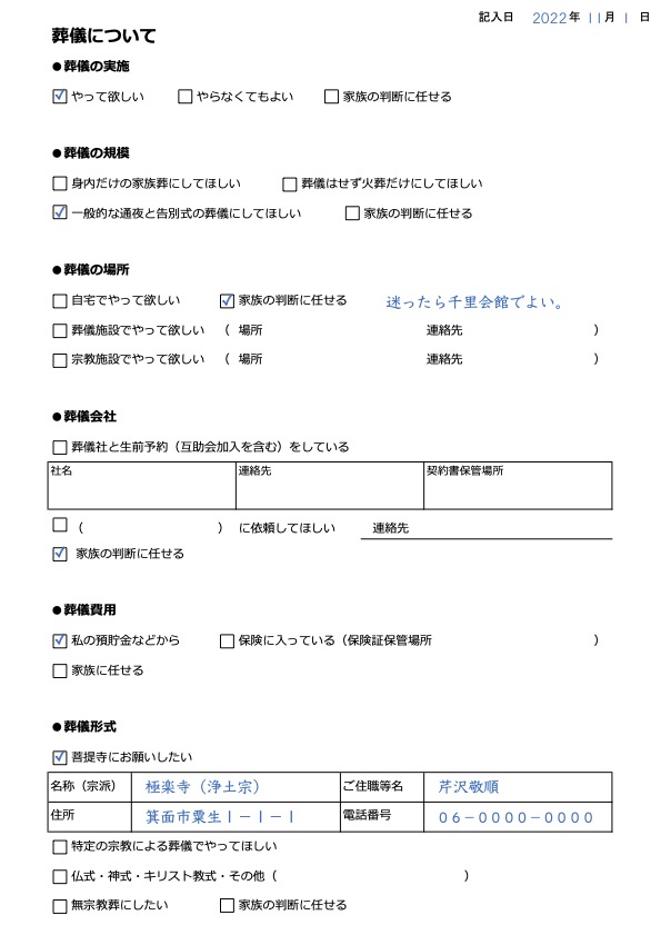 遺言書を作成している場合 □遺言書の種類(自筆証書・公正証書・秘密証書) □最終作生年月日 □保管場所(自宅・法務局・公証役場) □遺言執行者(氏名・名称・連絡先) ノートの1ページに手書きした遺言も要件(民法968条)を満たせば有効です。...
