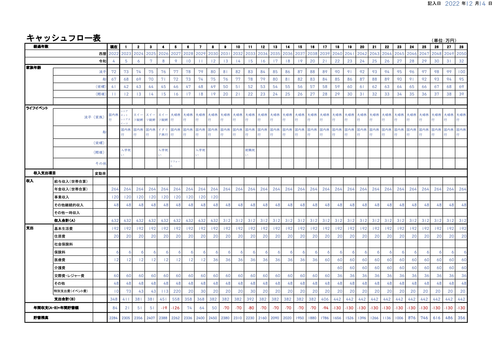 記入例(キャッシュフロー表) マネープラン 2022.12.14 エクセルでCF表を作成して、年間収支(貯蓄額)と貯蓄残高をグラフにしたのが下図です。記載例の伊園さんご夫妻、予測どおりにいけば波平さんが100歳になるまで老後資金の心配はなさそうですね。このようにエクセルでCF表を作成すると将来の資金の予測がグラフィカルに把握できるのでおすすめです。(弊所ではあなたオリジナルのエクセル表の作成もサポートしています。ぜひご相談ください)